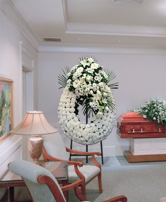 Nuestra Corona Funeraria, de Floristería In Memory D, son arreglos de flores que está realizada con flores de calidad, diversas, de condolencias para defunción en Tanatorios de España. Este arreglo incluye clavel blanco, gerbera blanca, lilium blanco, margarita blanca y verdes variados para funeral. Aprovecha el Envío Urgente de Flores a Tanatorios.